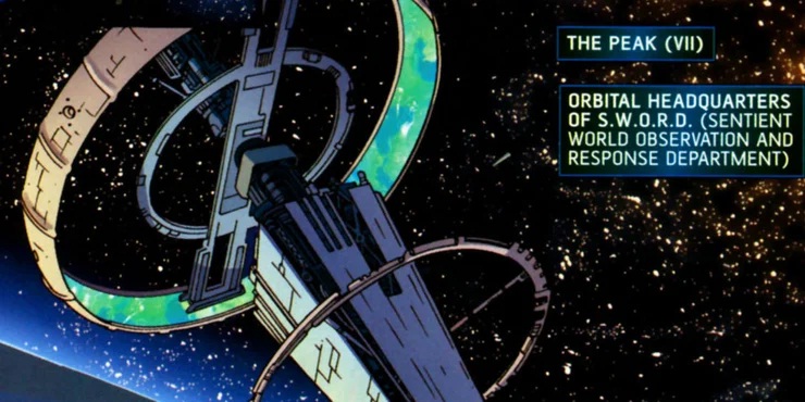 ABOVE: 2 examples of S.WO.R.D.’s various incarnations; BELOW: The Peak, SWORD’s orbital space station & headquarters